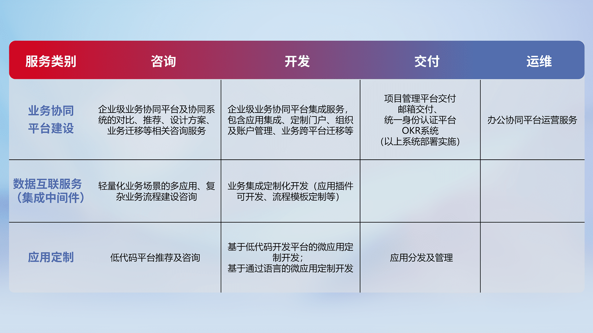 针对钉钉、、、企微、、、、IDaas等平台级产品提供产品的规划、、、方案、、交付、、定制化开发等服务,,,,实现如统一协同办公、、、智能客户服务、、混合会议管理、、智能数据查询、、、、等业务场景,,,,实现数字化转型。。。。