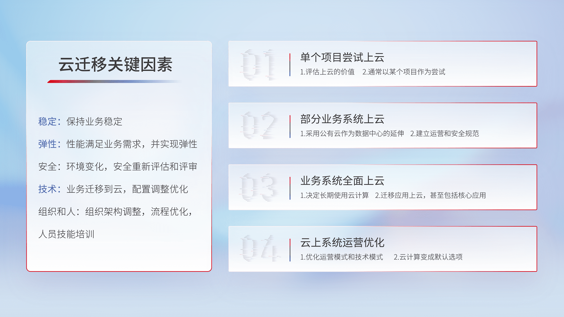 结合实际业务,,,,从规划设计、、、、云平台选型、、、、云原生改造、、、数据迁移、、集成交付,,迁移全过程为客户识别最佳上云路径,,,,做好风险识别管理,,设计网络架构、、、、身份权限、、、安全审计合规、、操作审计、、日志审计、、、、监控告警策略、、、多站点容灾设计等,,,,对云上基础设施进行整体规划,,,,提升IT治理水平,,,以满足弹性、、高可用、、高性能的需求。。。