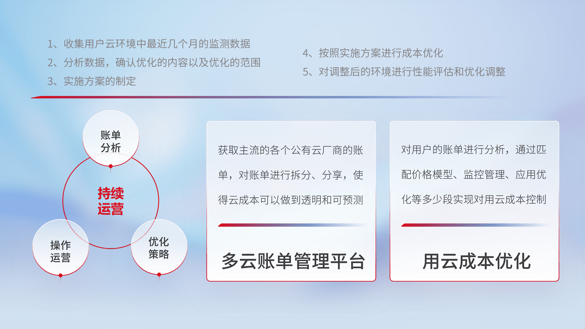 通过多云纳管,,以统一的资源数据模型把客户的云资源进行抽象和封装,,,,进而实现对多云资源的统一操作,,,,保障云资源管理的可靠性、、、稳定性与可用性。。。量身定制化运维内容,,,,配置、、、开发运维、、补丁管理、、、、备份、、、监控、、认证和访问管理、、审计和日常巡检等,,保障在用云过程中的可靠度,,,稳定度以及高可用率。。